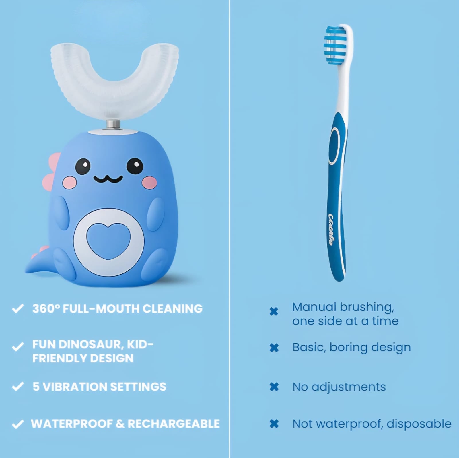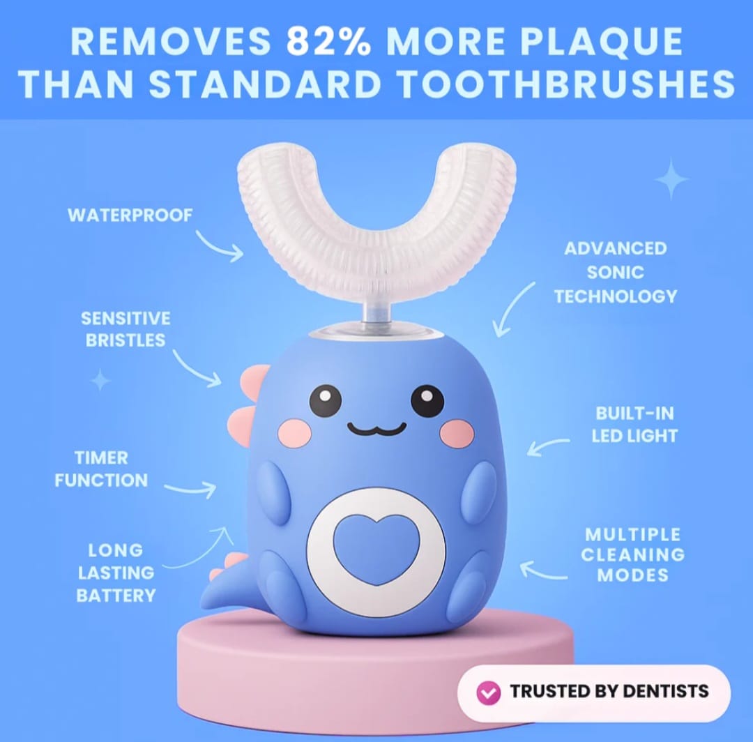 KamilaVerified BuyerThis toothbrush has completely changed our brushing routine! My 3-year-old loves the cute dino design and actually gets excited to brush now. The U-shaped head fits perfectly, the gentle vibrations work well, and the 5 modes are great. It’s easy to clean, waterproof, and comes with extra heads, great value. Her teeth already look cleaner!